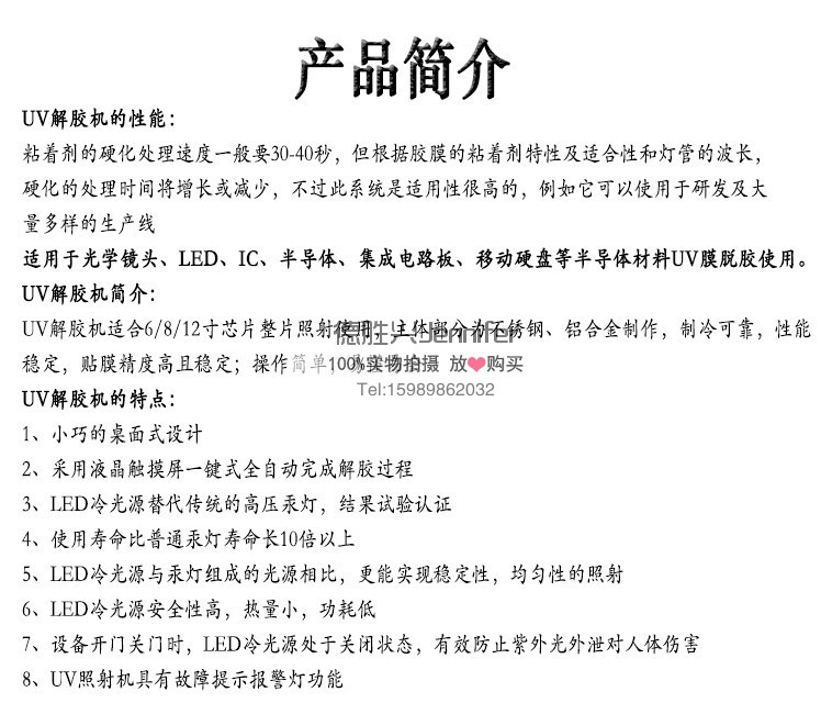 例如它可以使用于研發及大量多樣的生產線 適用于光學鏡頭、LED、IC、半導體、集成電路板、移動硬盤等半導體材料UV膜脫膠使用。